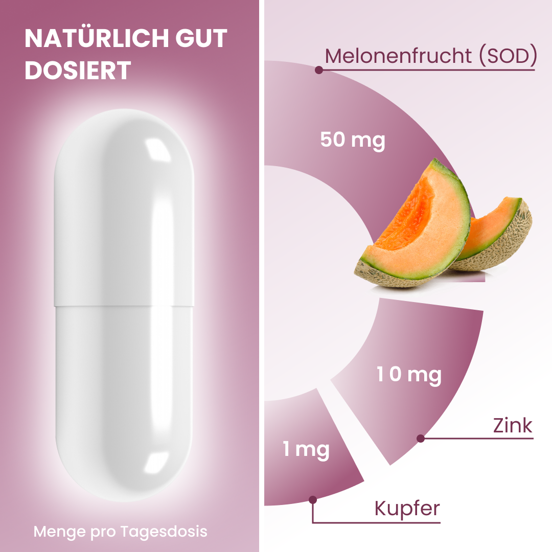 Der Grund für Cellulite liegt meistens im schlechten Bindegewebe. Genau hier setzt unser speziell für Sie entwickeltes Produkt CELLUVITE PLUS an. Die Kapseln enthalten unter anderem Melonenfruchtextrakt mit darin natürlich vorkommender Superoxid-Dismutase (SOD).