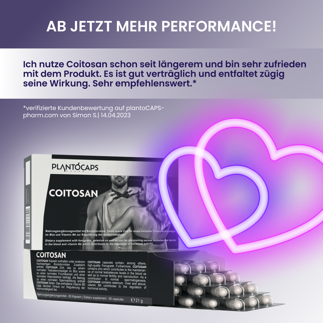 Zusätzlich enthält COITOSAN Zink, das zu einem normalen Testosteronspiegel im Blut sowie zu einer normalen Fruchtbarkeit und einer normalen Reproduktion beiträgt. Als Beitrag zu einer normalen Spermabildung enthält COITOSAN Selen. Das enthaltene Vitamin B6 trägt darüber hinaus zur Regulierung der Hormontätigkeit bei.