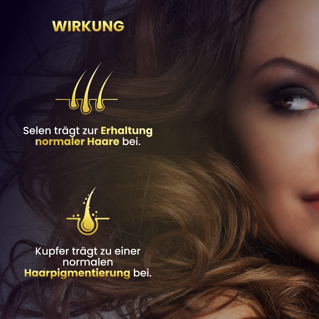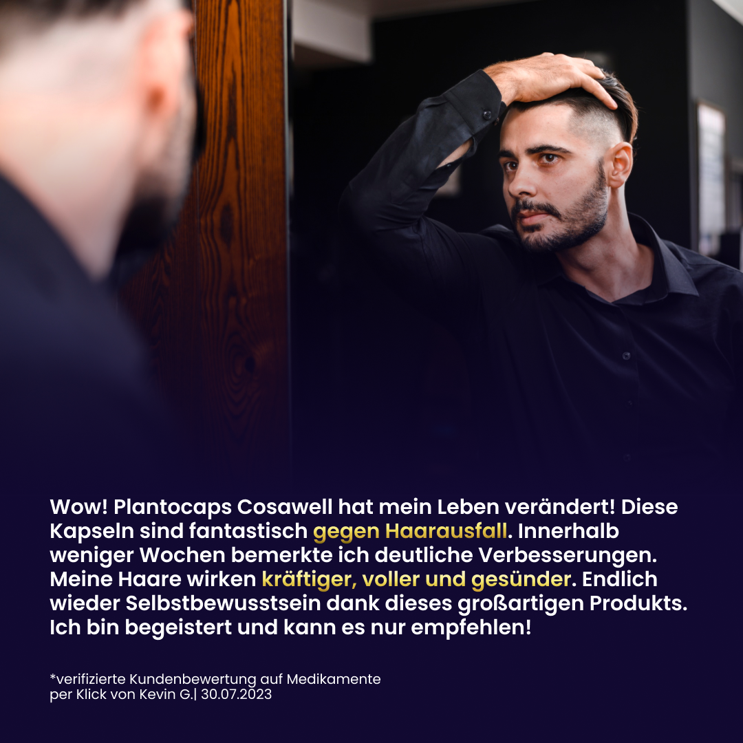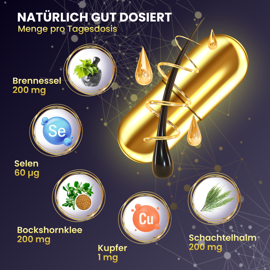 COSAWELL Kapseln enthalten unter anderem Schachtelhalm, Brennnessel und Bockshornklee. Zusätzlich enthält COSAWELL Selen, das zur Erhaltung normaler Haare beiträgt, sowie Kupfer, das einen Beitrag zu einer normalen Haarpigmentierung leistet.