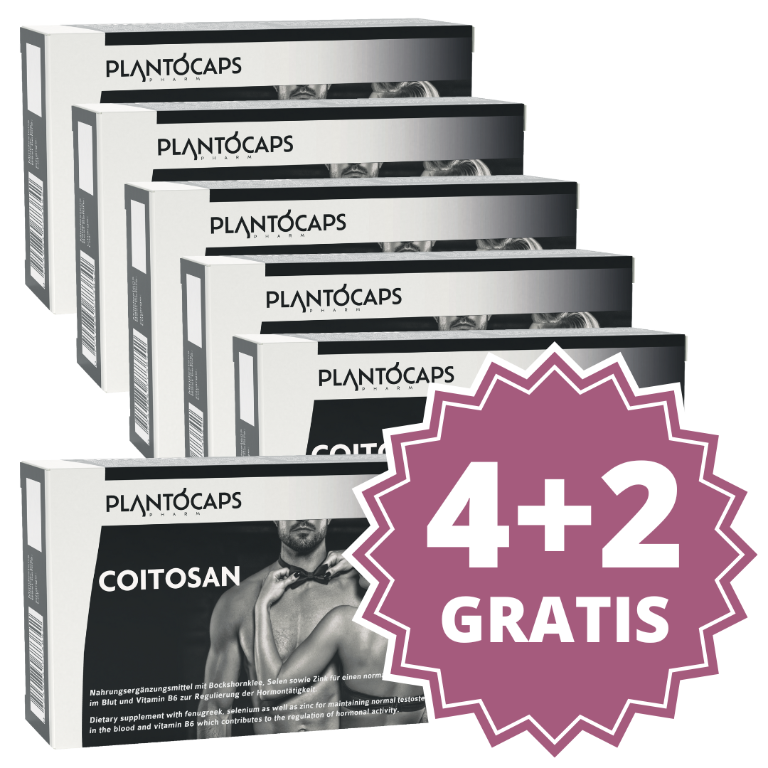 COITOSAN Kapseln enthalten unter anderem Bockshornklee. Zusätzlich enthält COITOSAN Zink, das zu einem normalen Testosteronspiegel im Blut sowie zu einer normalen Fruchtbarkeit und einer normalen Reproduktion beiträgt. Als Beitrag zu einer normalen Spermabildung enthält COITOSAN Selen. Das enthaltene Vitamin B6 trägt darüber hinaus zur Regulierung der Hormontätigkeit bei.